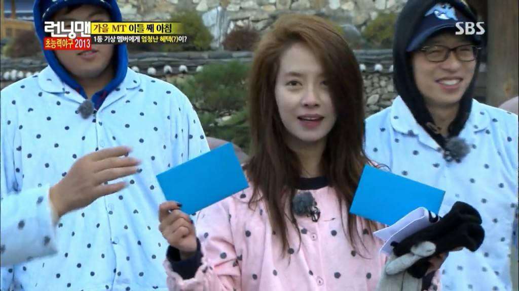 running man131124起床任务一向视misson胜过形象Ace宋智孝第一个起床,没有化妆,没有梳理的素颜面孔果断肿了起来。虽然没睡醒,却拿到两张票子。在石神意味深长的抱抱还是没有打动智孝,因为不是gary!